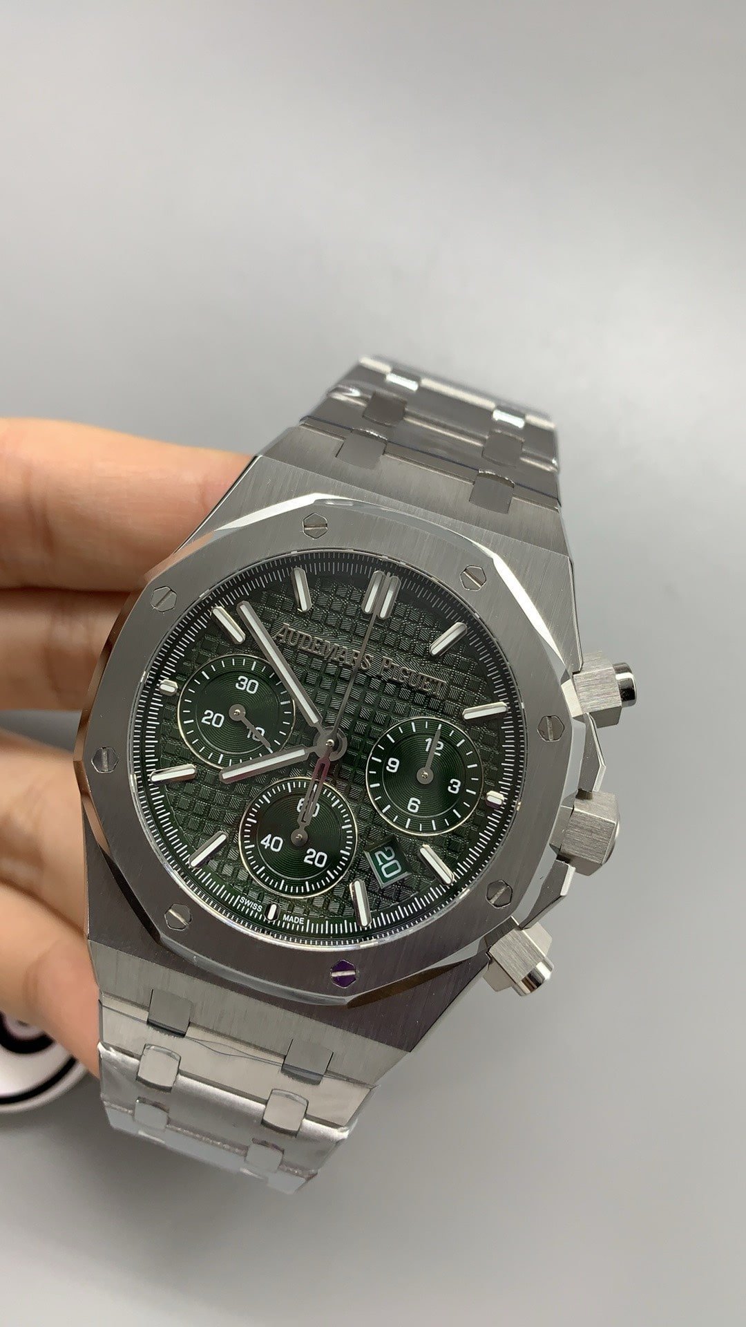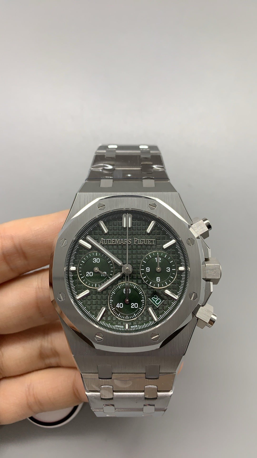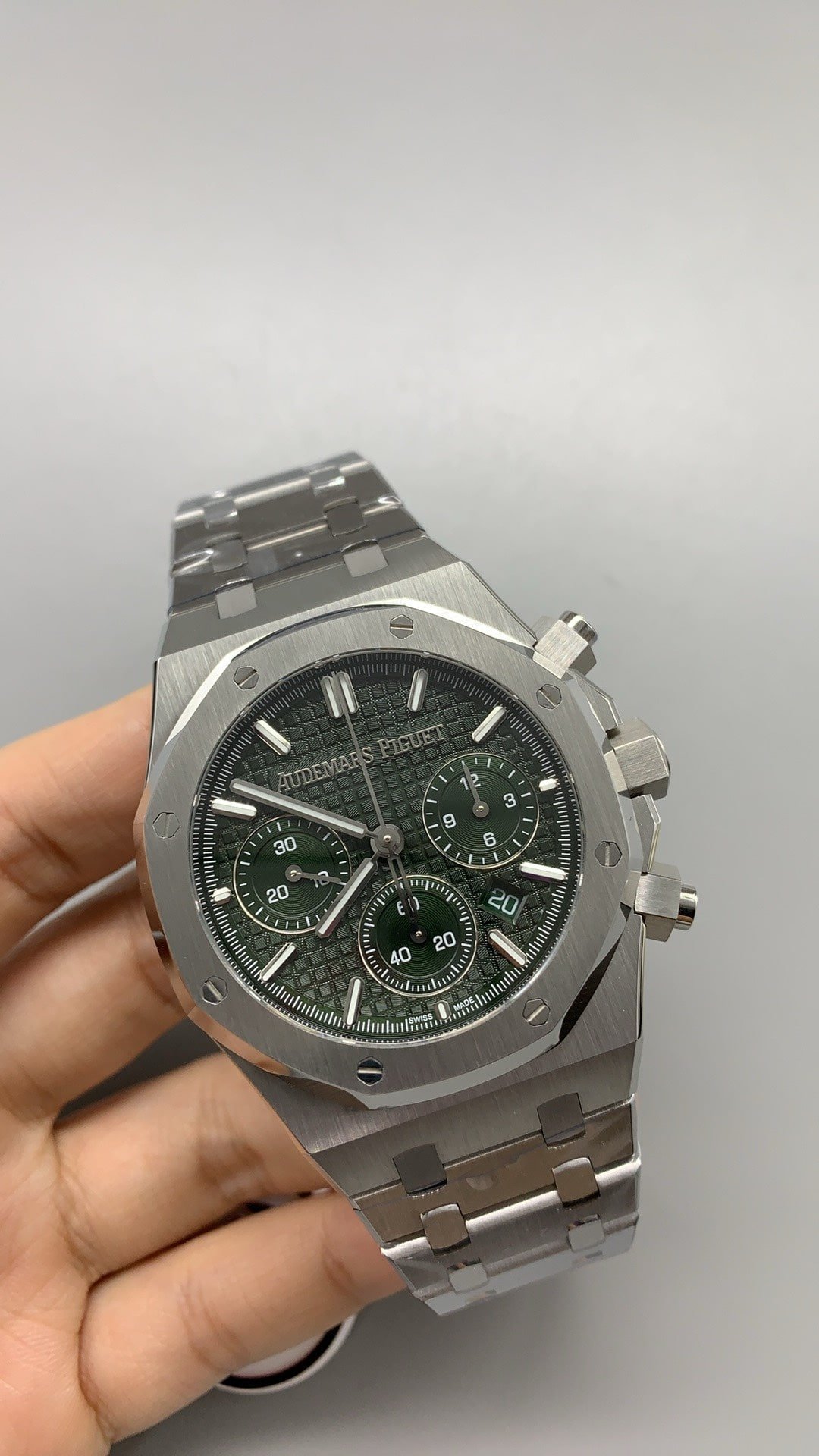 Experience luxury with 41mm Royal Oak Super Clone in stainless steel. Its octagonal bezel encases a khaki green Grande Tapisserie dial with matching subdials. Automatic Caliber 4401 movement includes a flyback chronograph.