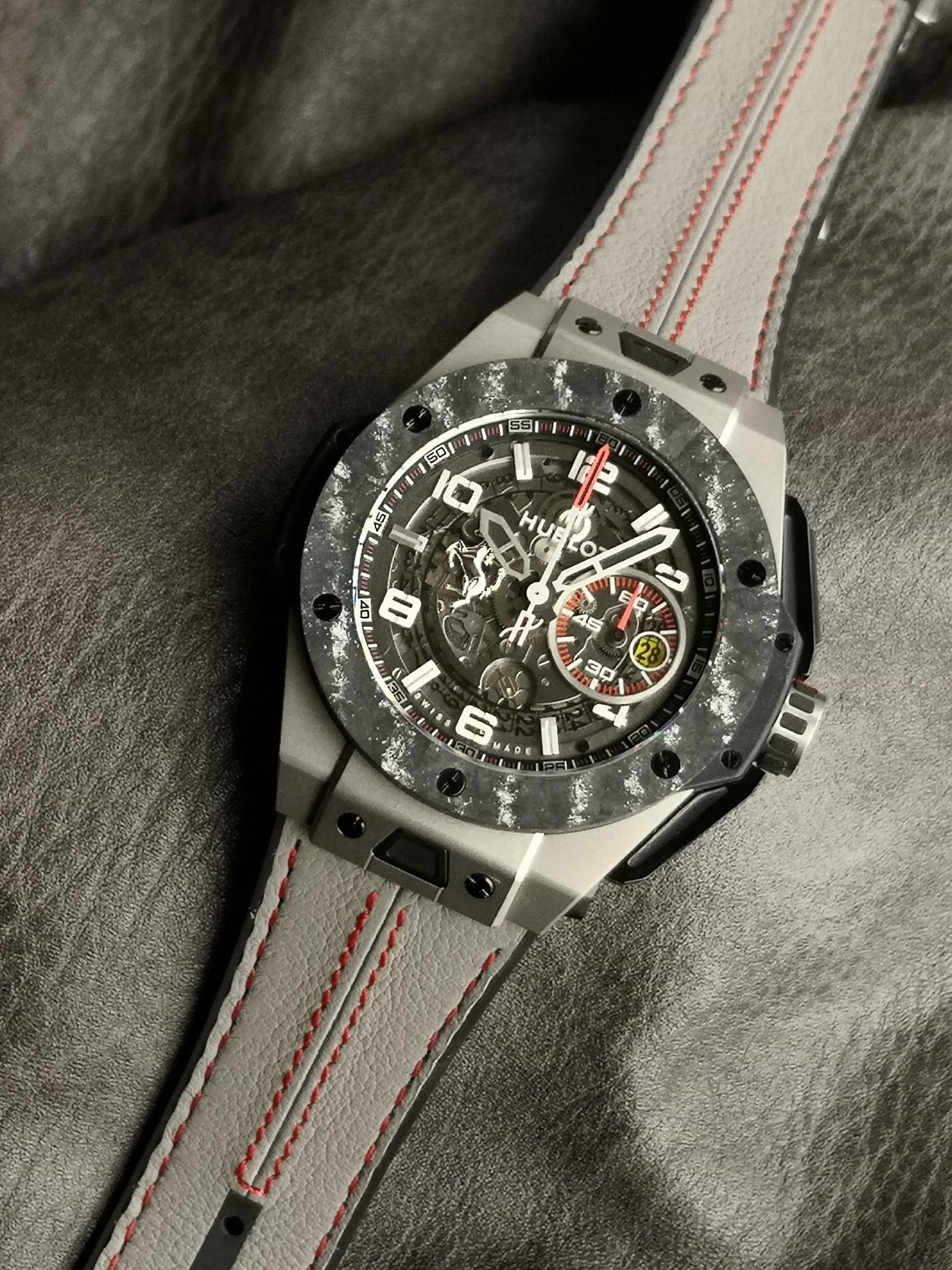• Dial: Skeletonized hour hands, Ferrari-inspired details in date dial and date window, and luminous hands