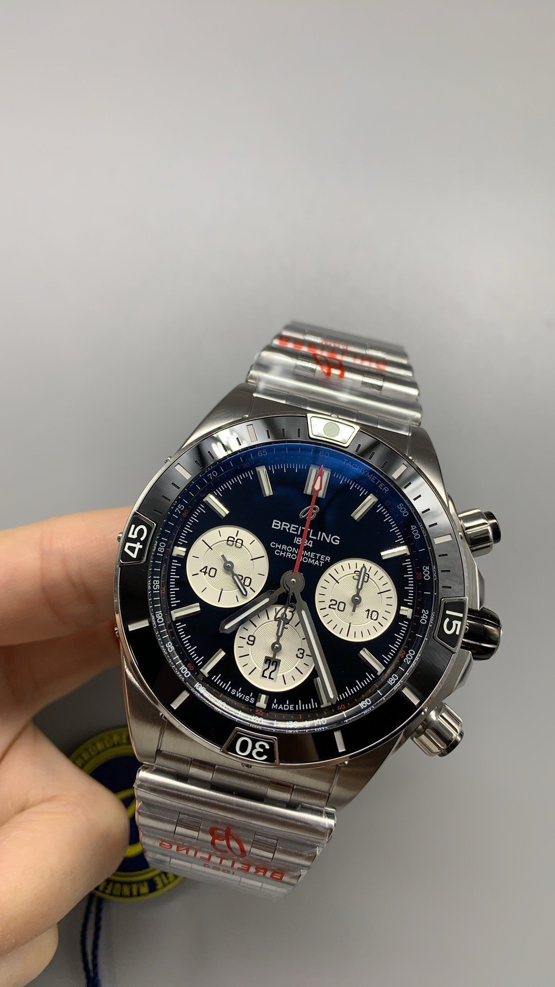 Experience precision and luxury with the Breitling Chronomat Super Clone in a 44mm stainless steel case, featuring a black dial with chronograph, a Swiss self-winding 01 movement, and 200m water resistance.