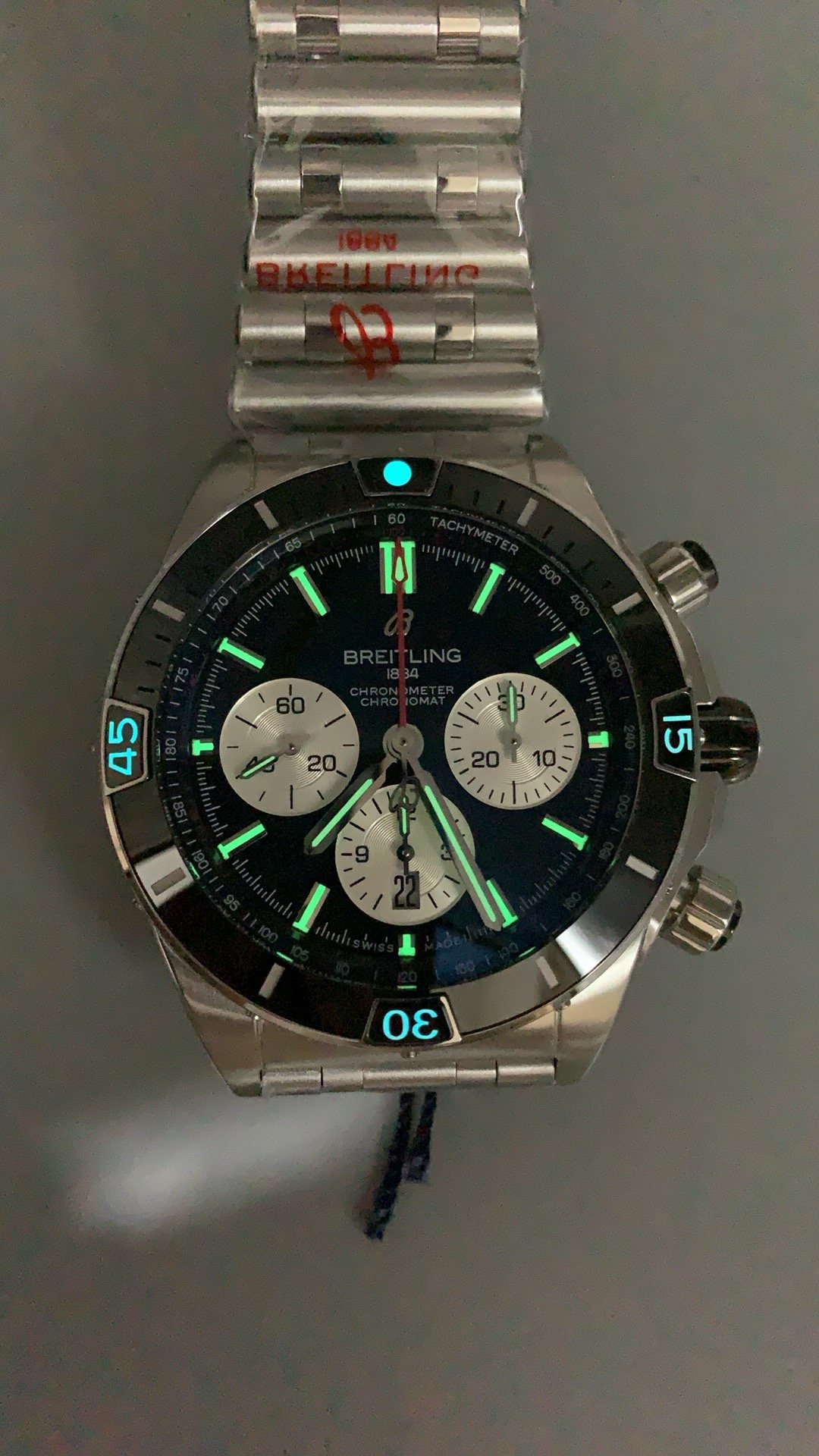 • Dial: Black dial, white subdials, date window, and luminous hands and markers