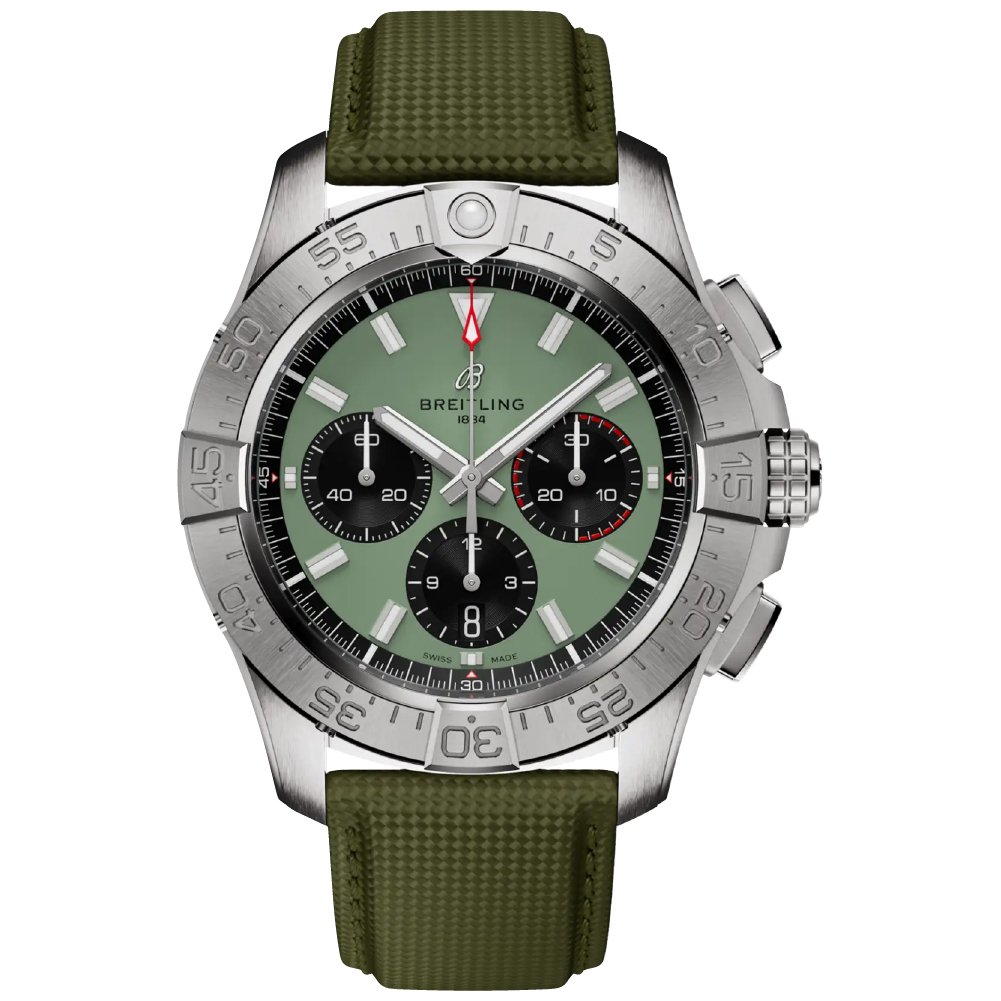 Inspired by military shades, this 44mm stainless steel Chronmat Super Clone has a distinct green dial with three chronograph subdials and bold red accents. The Swiss self-winding 01 movement offers a 70-hour reserve.