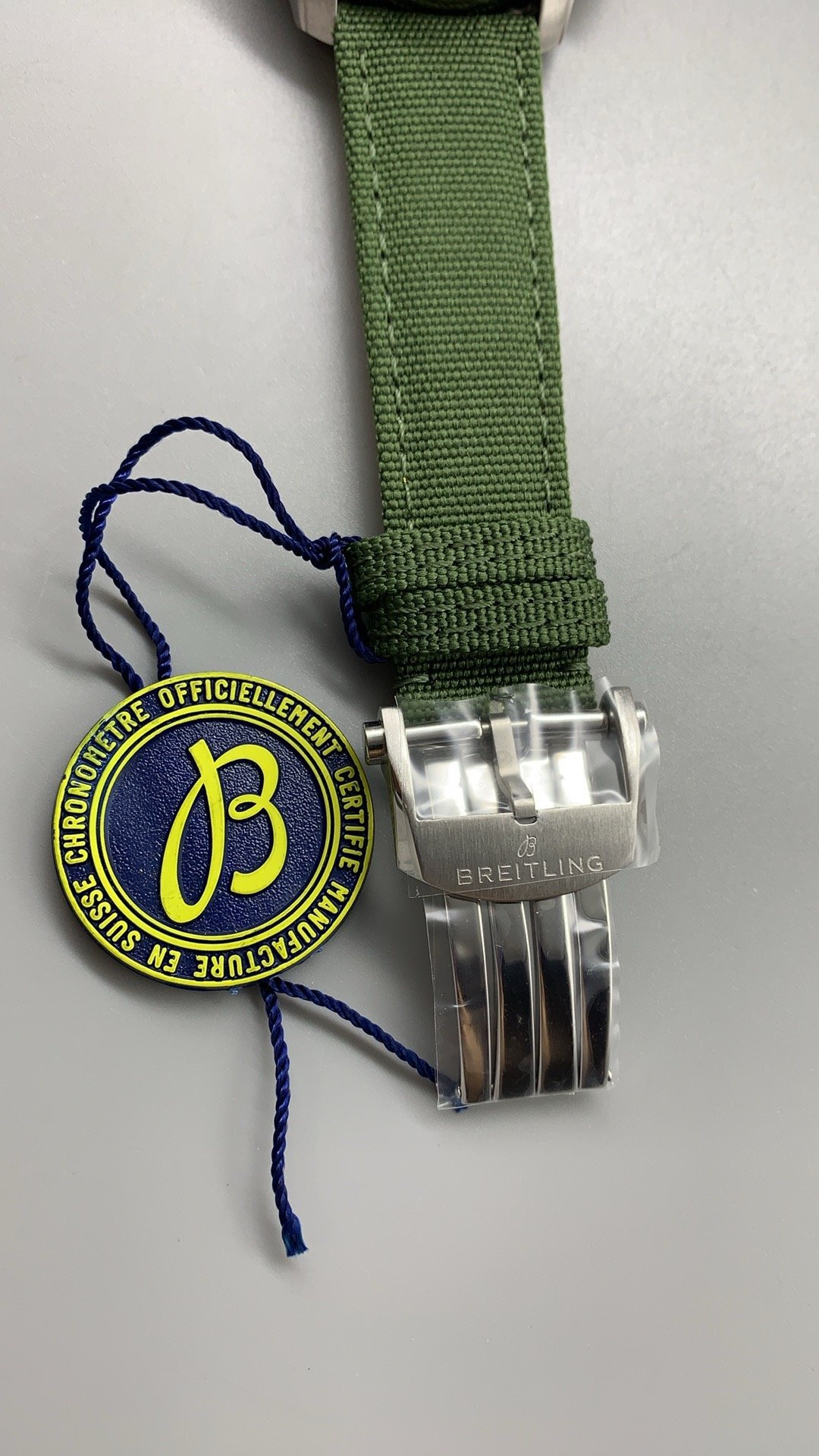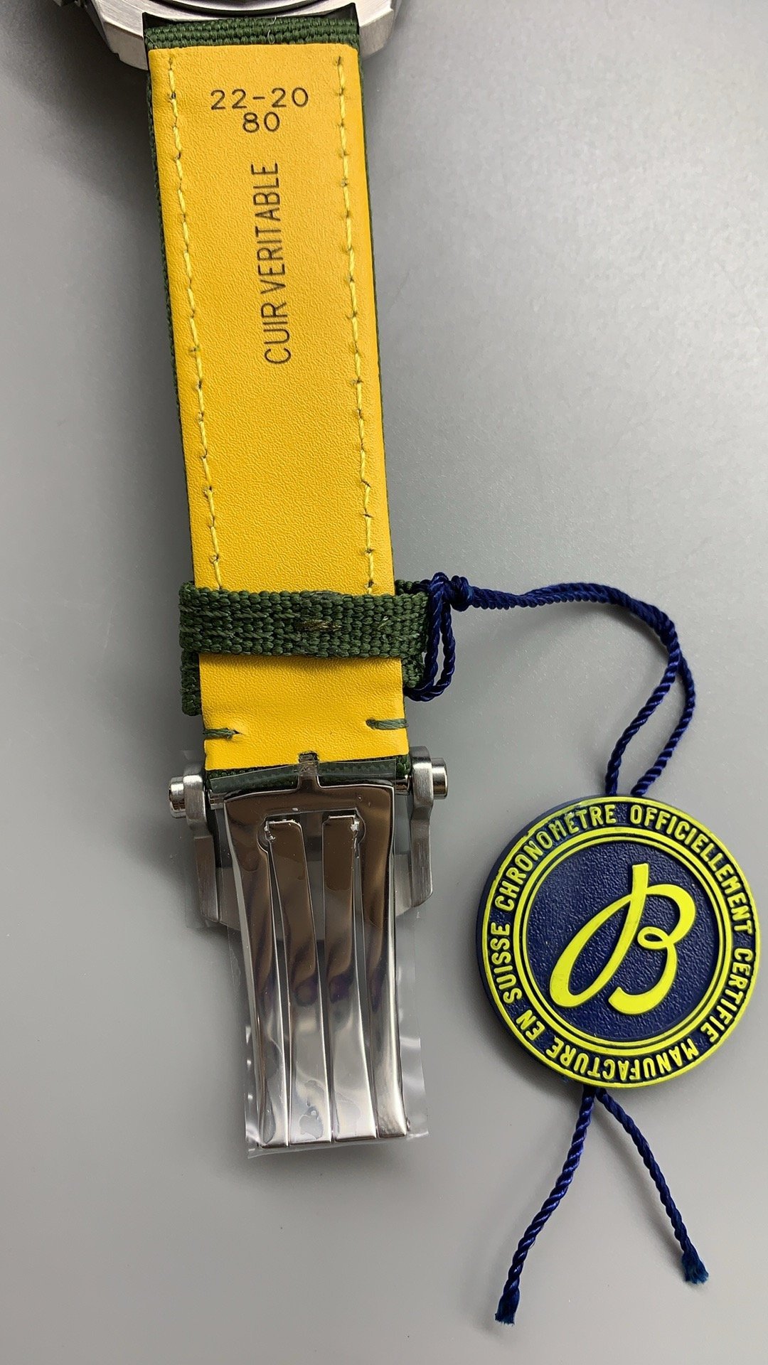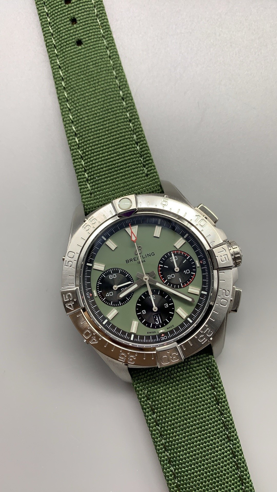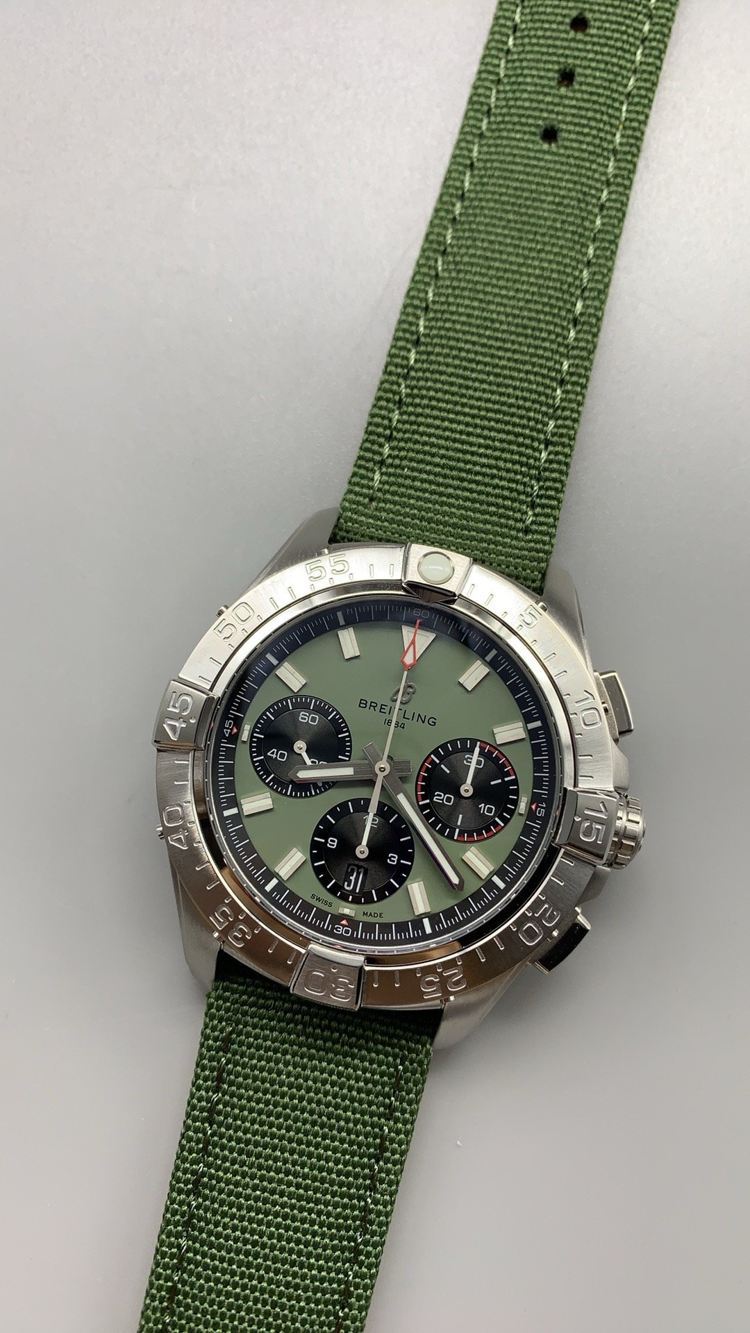 Breitling Chronomat B01 Super Clone has a 44mm stainless steel case with a screwed-in sapphire crystal back. The watch features a green strap with a stainless-steel folding clasp.