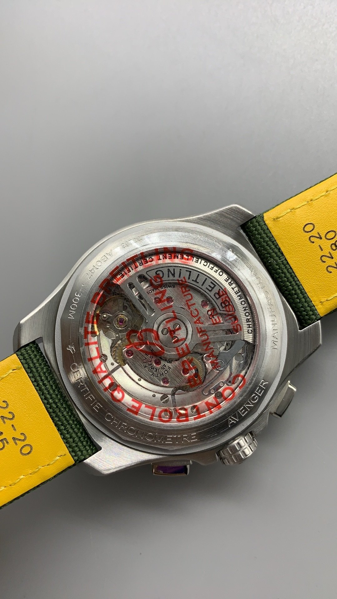 Breitling Super Clone dial color is drawn from the military green uniform shades. It has three chronograph subdials with a date window at 6 o’clock. The Chronomat Super Clone also features red accents in the seconds hand and 30-minute chronograph subdial. Moreover, all the hour indexes and hands are luminescent, ensuring legibility in the dark. The Super Clone runs on a self-winding mechanical movement with a power reserve of up to 70 hours.