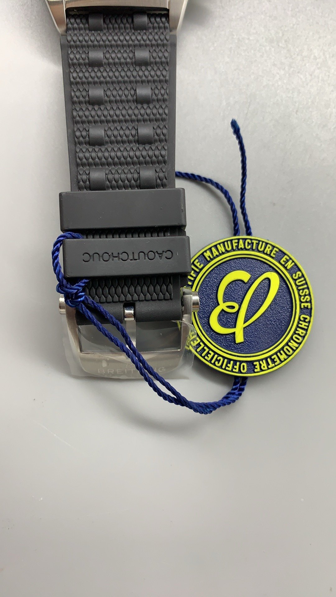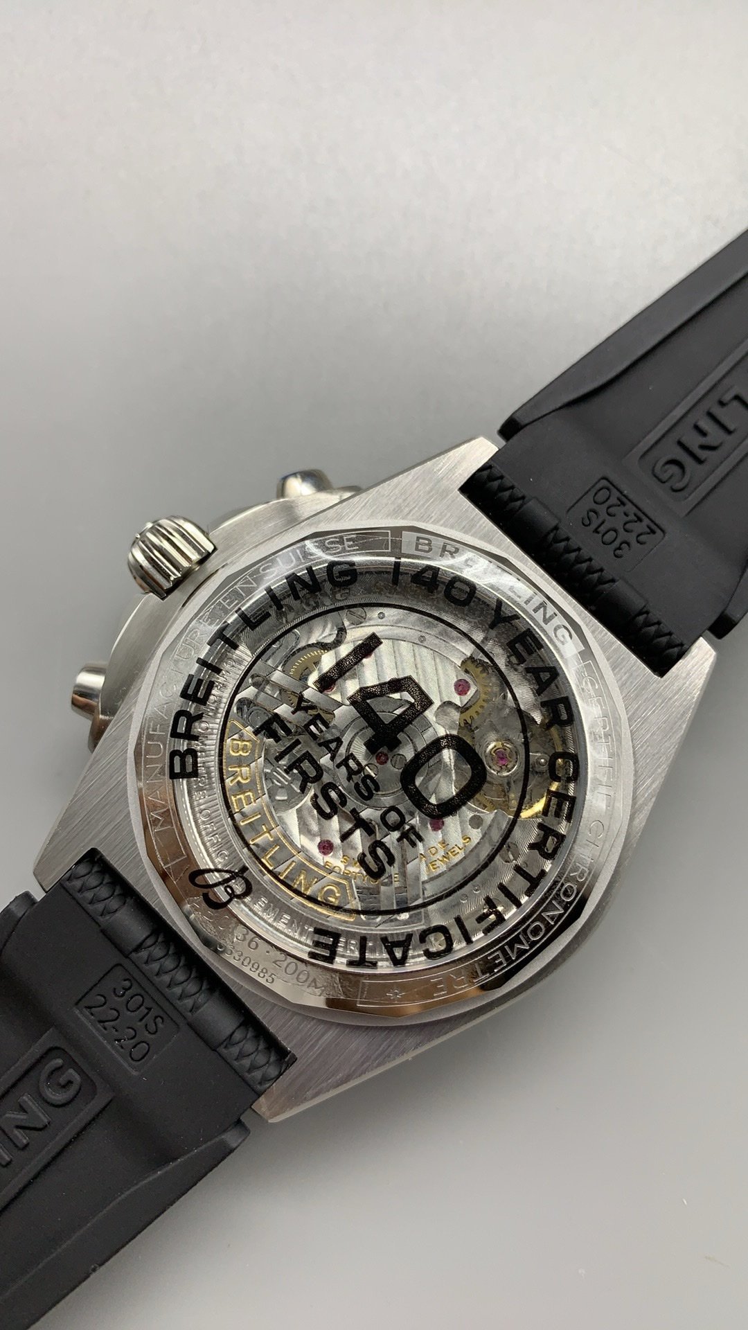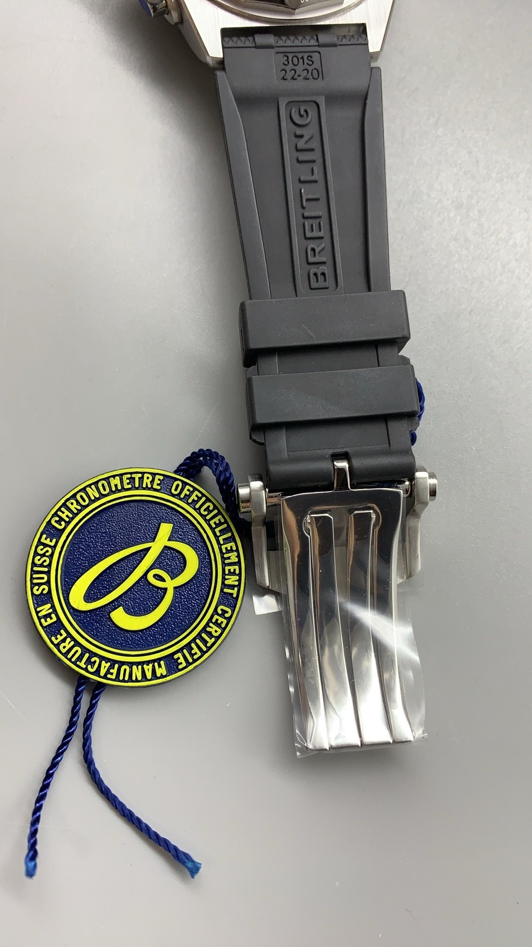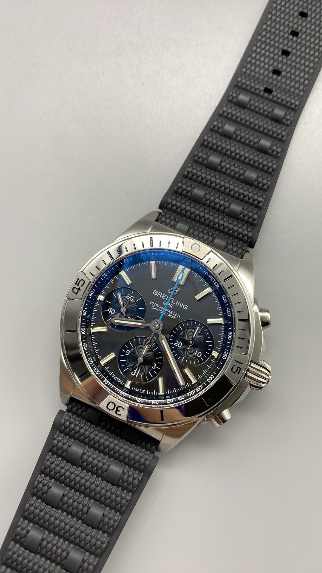 Embodying aviation history, this 42mm titanium Super Clone Chronomat features a sleek grey dial with three contrasting black chronograph subdials and iconic rider tabs powered by a Swiss self-winding 01 movement.