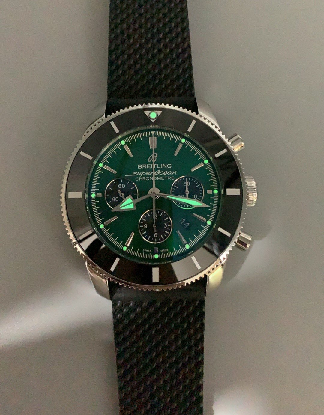 Own iconic dive heritage with this Breitling Superocean Heritage B01 Super Clone, pairing a striking green dial, contrasting black chronograph subdials, ceramic bezel, and Swiss Clone 01 movement.
