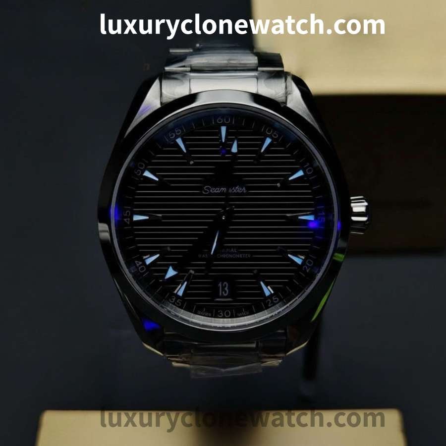 Refined yet sporty, the sophisticated stainless steel Omega Aqua Terra Super Clone has a beautiful black dial with a unique teak pattern. Running on a Swiss 8900 movement, it ensures precise timekeeping and versatile luxury.