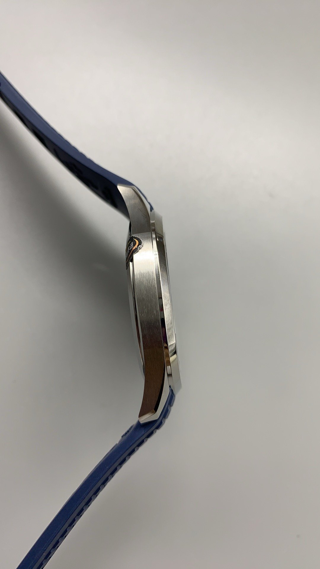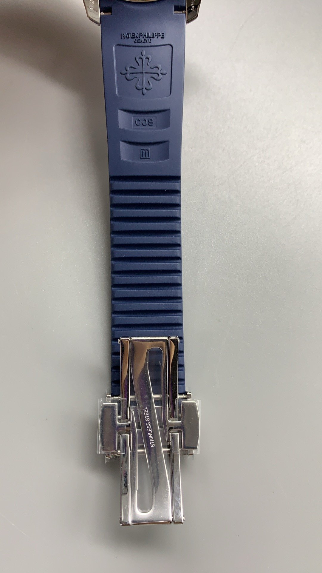The anniversary edition of Patek Philippe Aquanaut 5168G-001 Super Clone has a jumbo 42.2mm white gold case with a sapphire crystal back and top. This Super Clone ensures a comfortable and firm fit with its composite strap in midnight blue and foldover clasp.