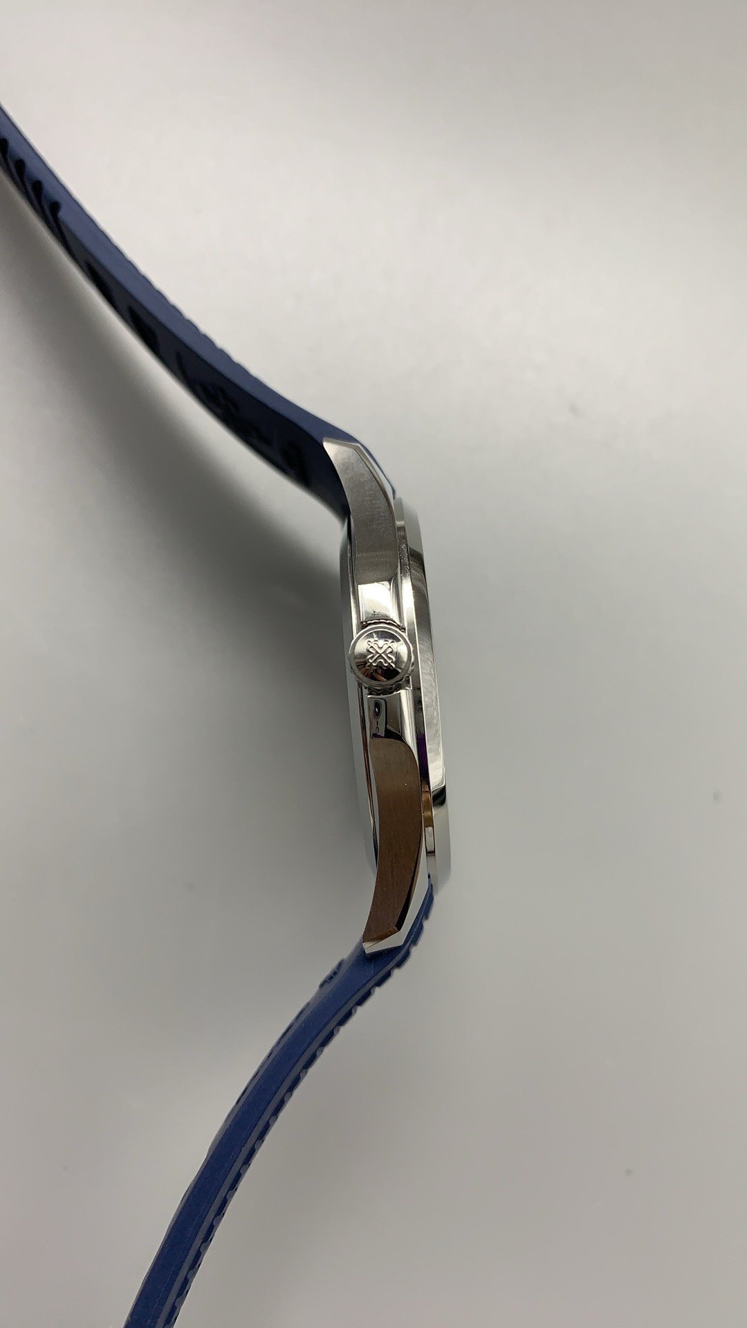 - Dial: Blue embossed dial with luminous white gold luminescent Arabic numerals and markers