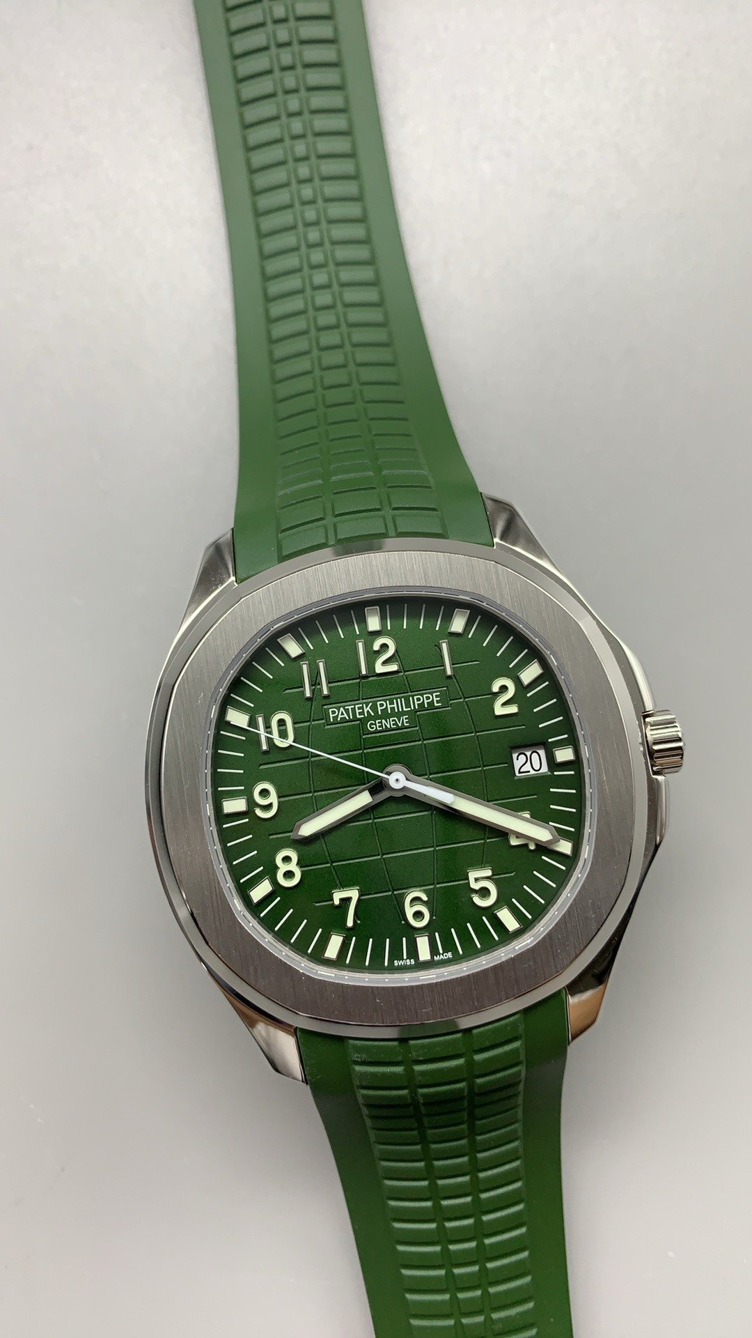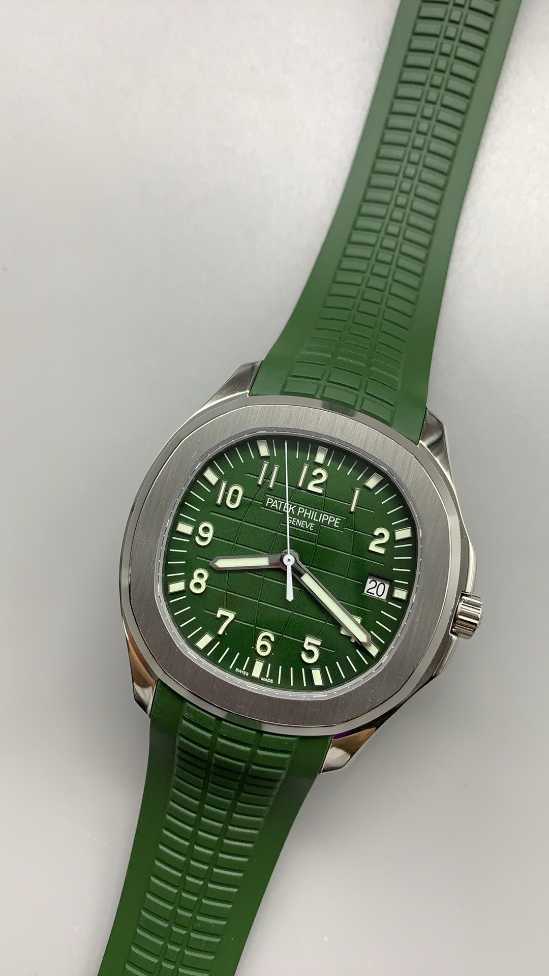 Modern and sporty, the Jumbo 42.2mm Aquanaut Super Clone has a white gold case, a khaki green embossed dial, and a composite strap. The Swiss watch delivers standout performance with its CH 28-520 C/522 movement.