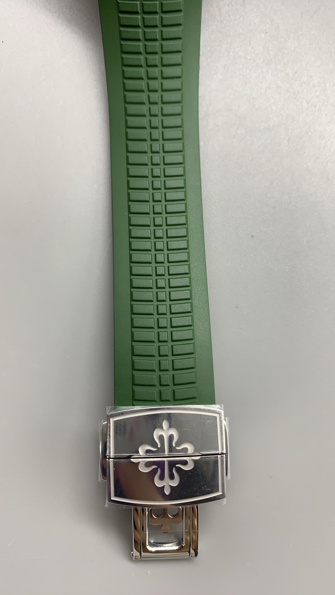 • Bracelet: Khaki green rubber strap with a fold-over clasp