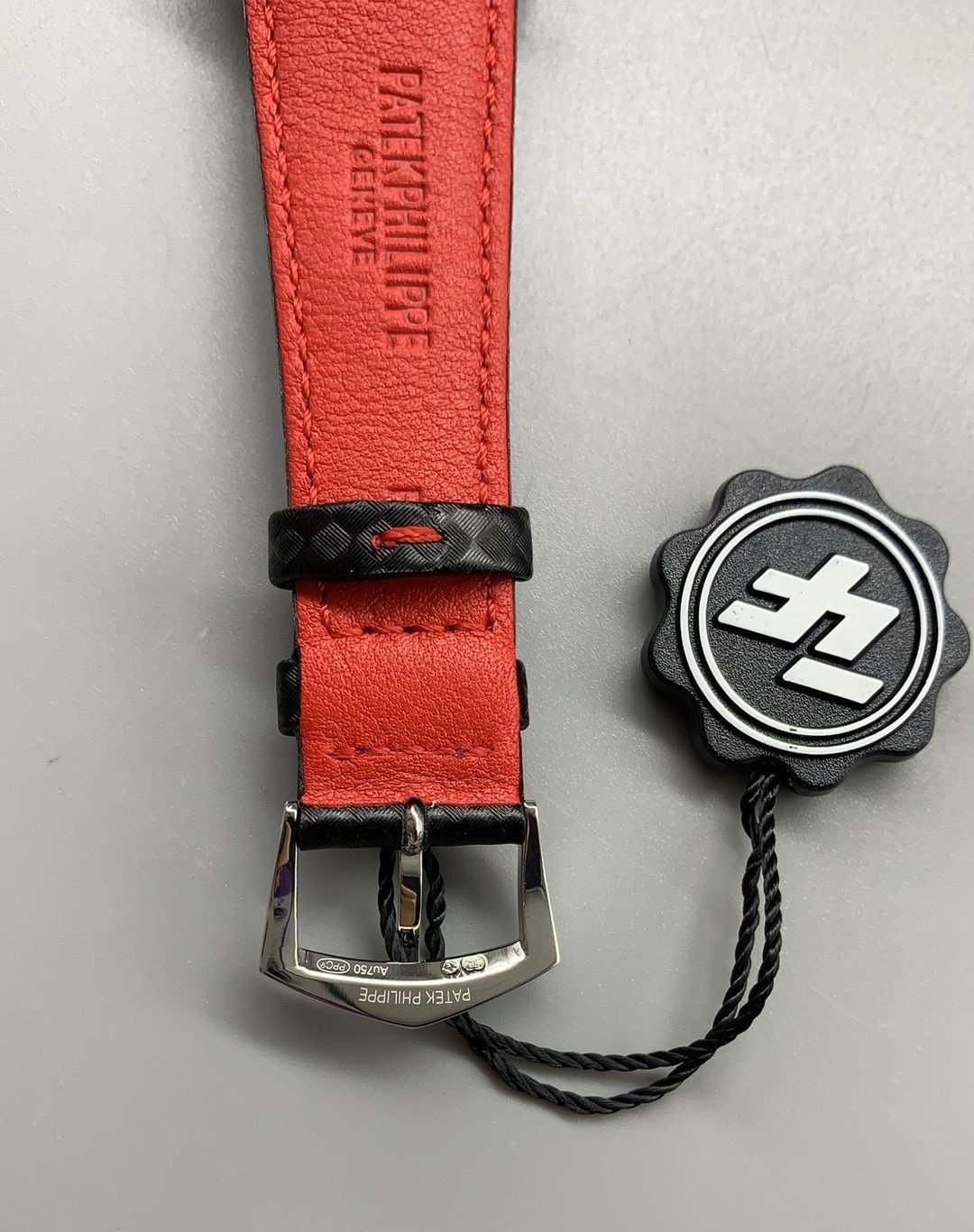Bold elegance meets modern design in Calatrava Super Clone, featuring a black carbon-pattern dial, vivid red accents, a Swiss automatic 26-330 S C/430 movement, and finished with a carbon-patterned calfskin strap.