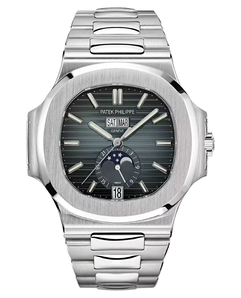 Exquisite 40.5mm Patek Philippe Nautilus in stainless steel houses a blue dial with a moon phase and annual calendar complication. Precision self-winding Caliber 26-330 S QA LU powers the watch precisely.