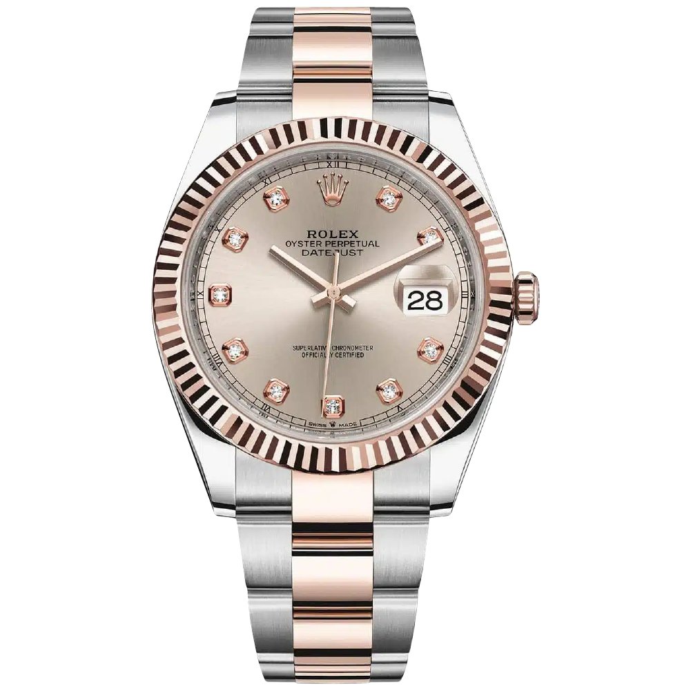 The 41mm Rolex Datejust 126331-0007 Super Clone has an Oystersteel and Everose gold with a stunning fluted bezel. The functional piece that used to tighten the case is now an essential part of the watchโs aesthetics. This Datejust 126331-0007 Super Clone has a stunning sundust dial with diamond-set gold hour indexes. The dial also has a date window at 3 oโclock with a cyclops lens.