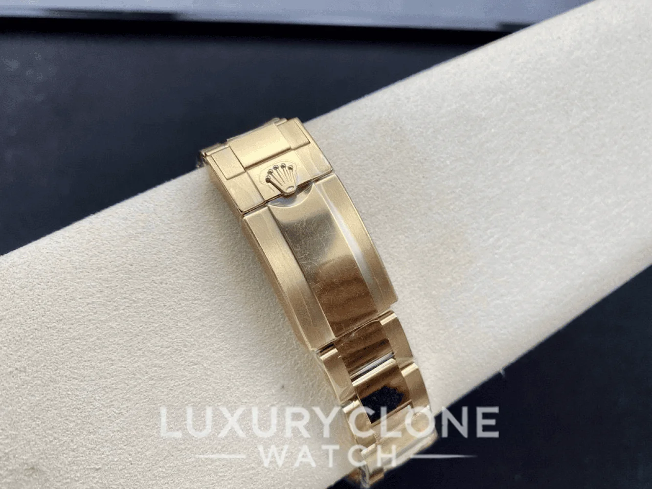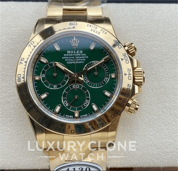 The Cosmograph Daytona 116508-0013 Super Clone is a 40mm Yellow Gold watch with a matching bracelet and clasp. This watch has a beautiful green dial complemented with luminescent hour indexes and baton hour hands. This Rolex Daytona Super Clone features a yellow gold bezel with a tachymeter scale, highlighting the watch’s racing heritage.