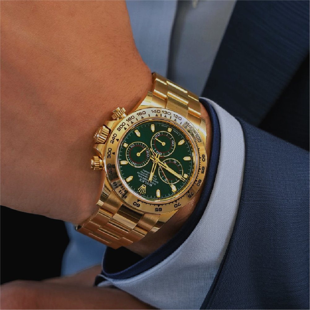 Own the Iconic Rolex Daytona featuring a striking yellow-gold case, tachymeter bezel, and a unique green dial featuring three chronograph subdials. Its automatic 4130 movement with a 72-hour reserve makes it ideal for racing enthusiasts and music lovers.