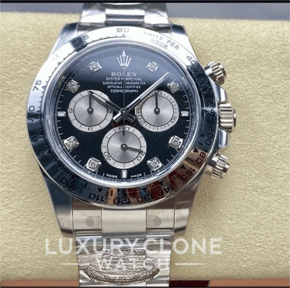 Rolex Daytona 126509-0002 Super Clone is a 40mm with a white gold case and an engraved tachymetric scale. This watch has a comfortable three-piece solid links 18k white gold bracelet with Oysterlock folding clasp. Rolex Super Clone has a beautiful black dial and steel chronograph subdials. This watch also features the diamond-set hour indexes with luminescent markers at 3, 6, and 9 o’clock.