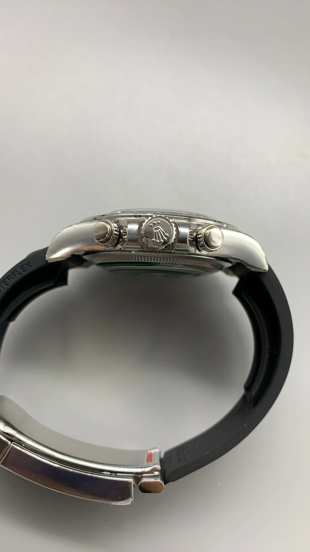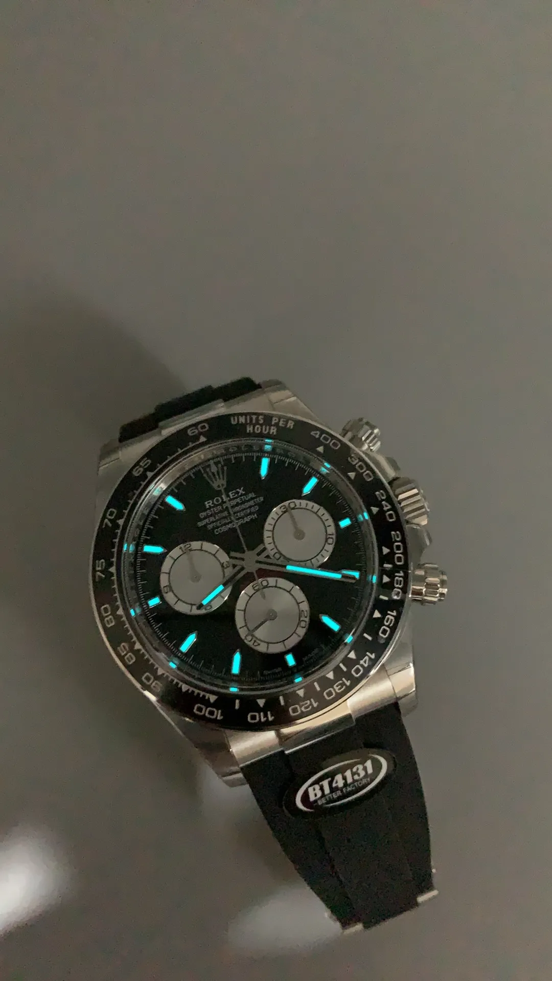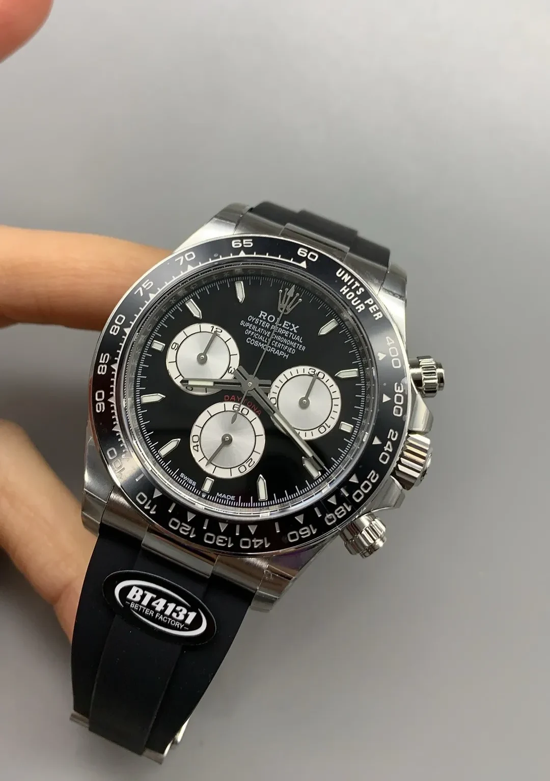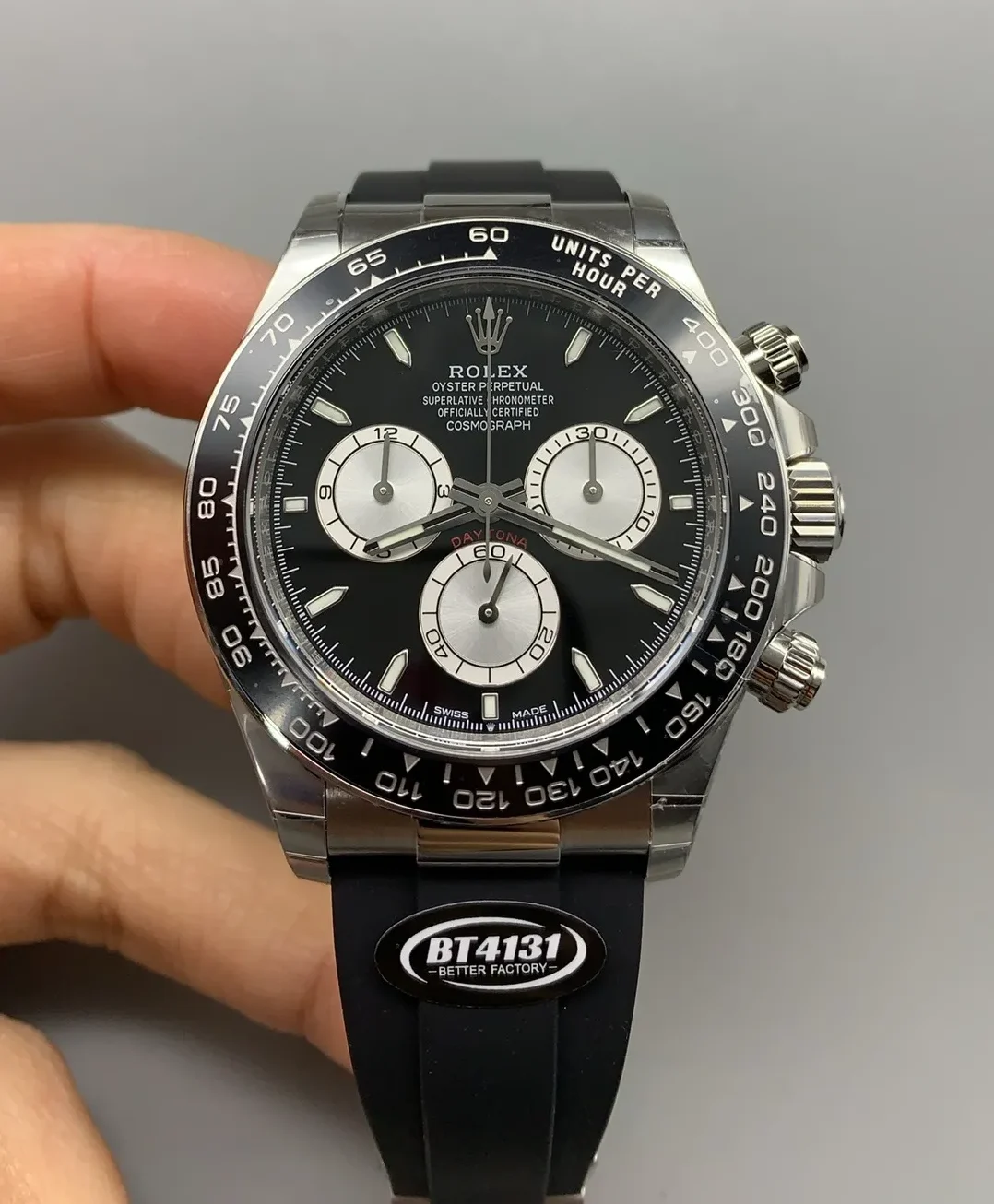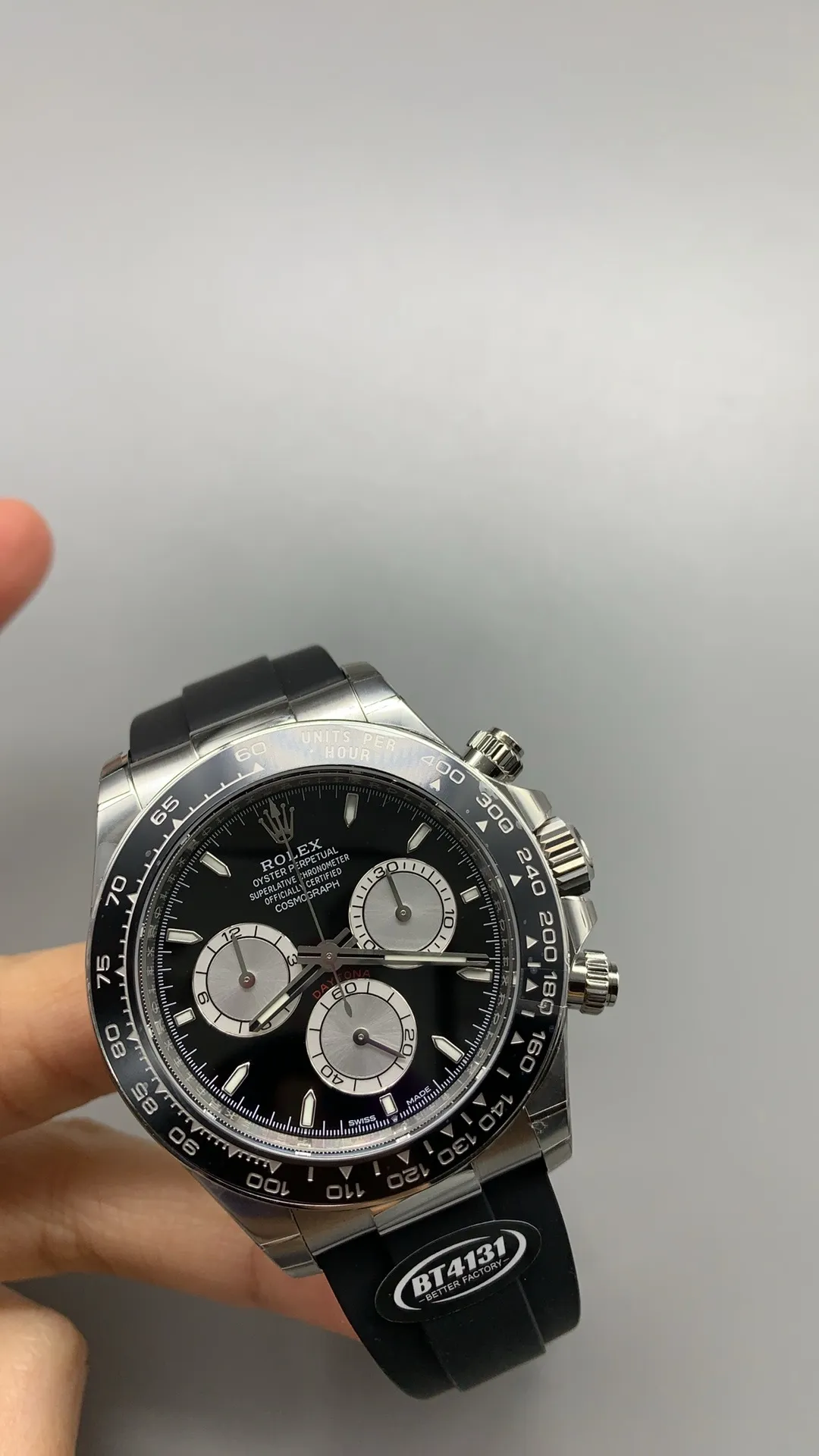 Rolex Daytona Super Clone has three chronographs subdials (30-minute counter, 12-hour counter and Stop Seconds) running on a Swiss perpetual, mechanical chronograph, self-winding movement.
