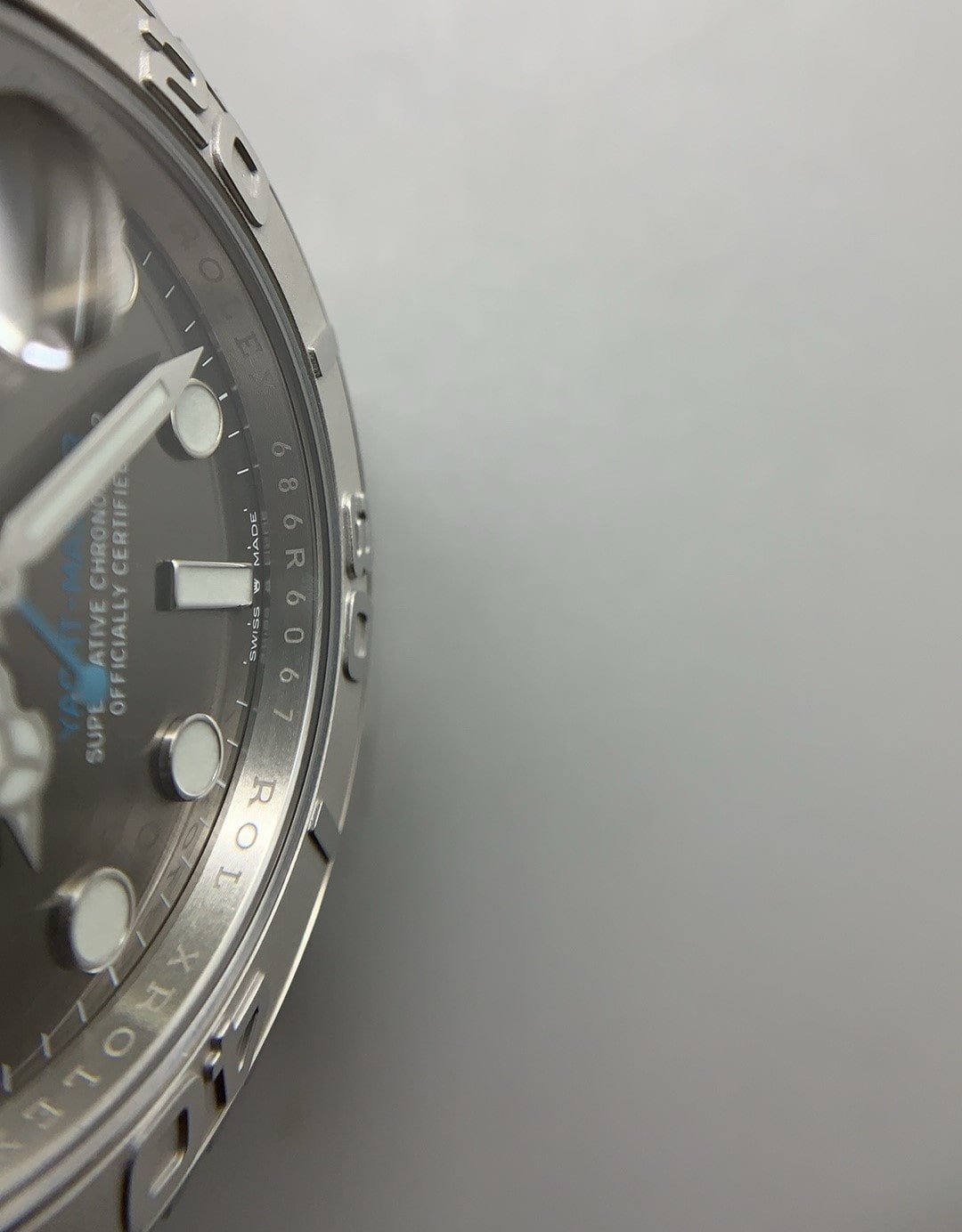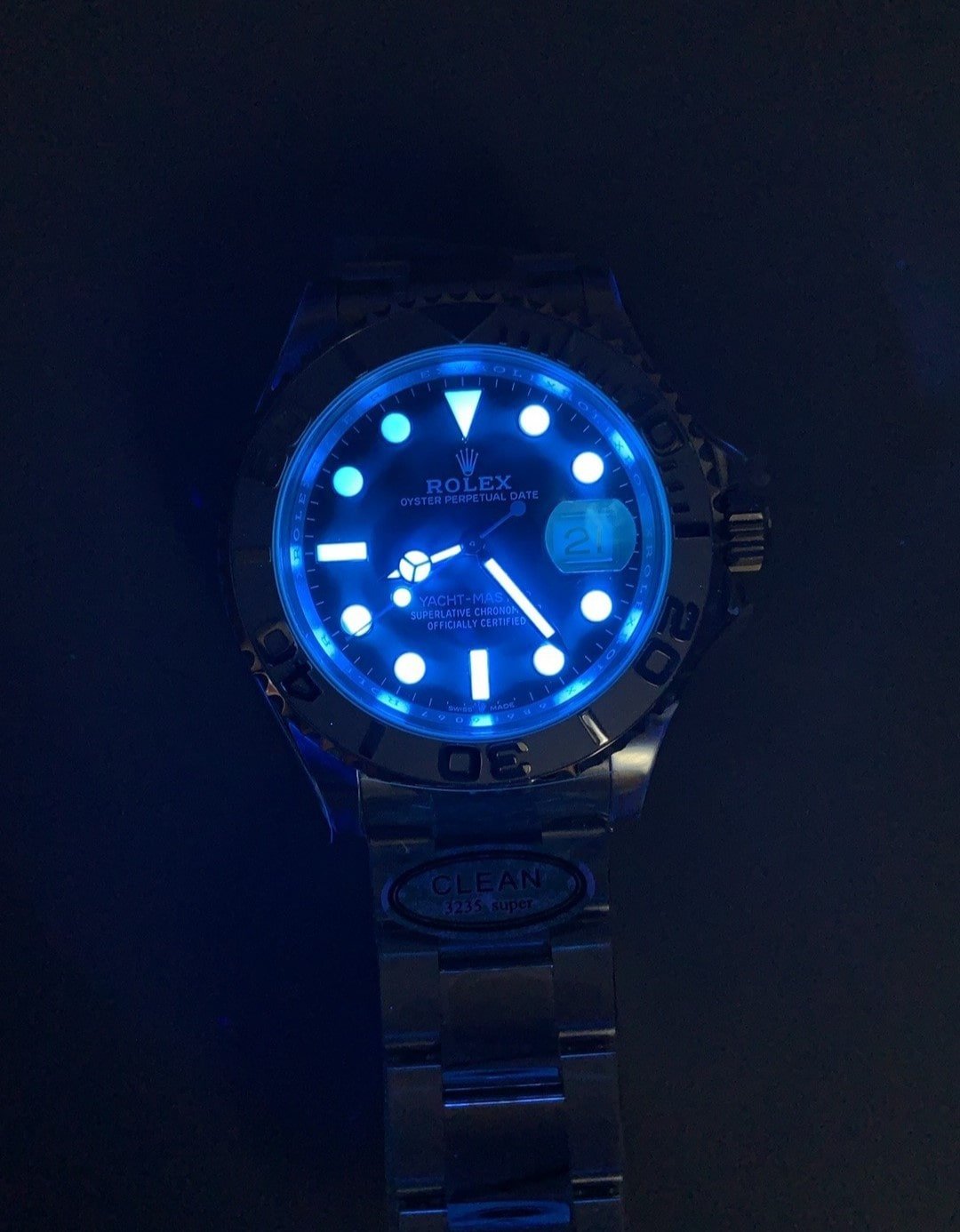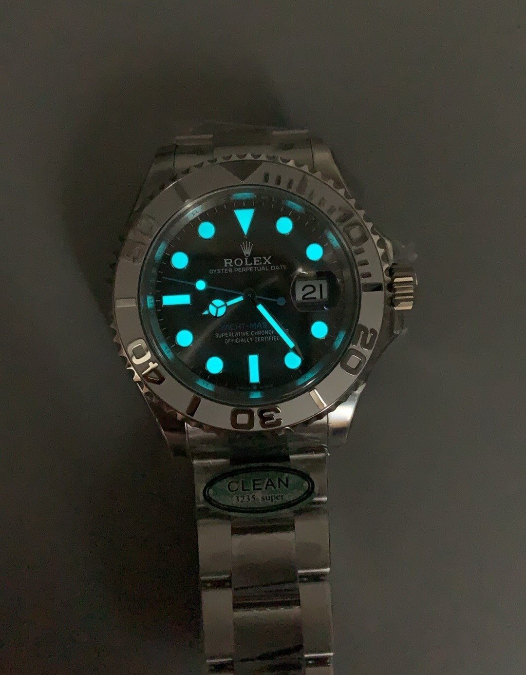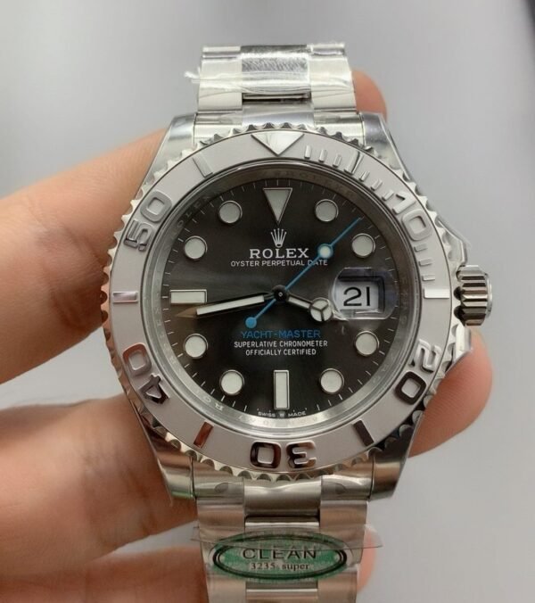 The compact 37mm Rolex Yacht-Master Super Clone is made from a combination of Oystersteel and Platinum. Yacht Masterโ€™s rotatable platinum bezel has Cerachrom polished numerals adding a polished appearance to the Super Clone. The watchโ€™s slate dial is complemented with luminescent white hours hands and markers. It also has a date window at 3 oโ€™clock with a Cyclops lens.