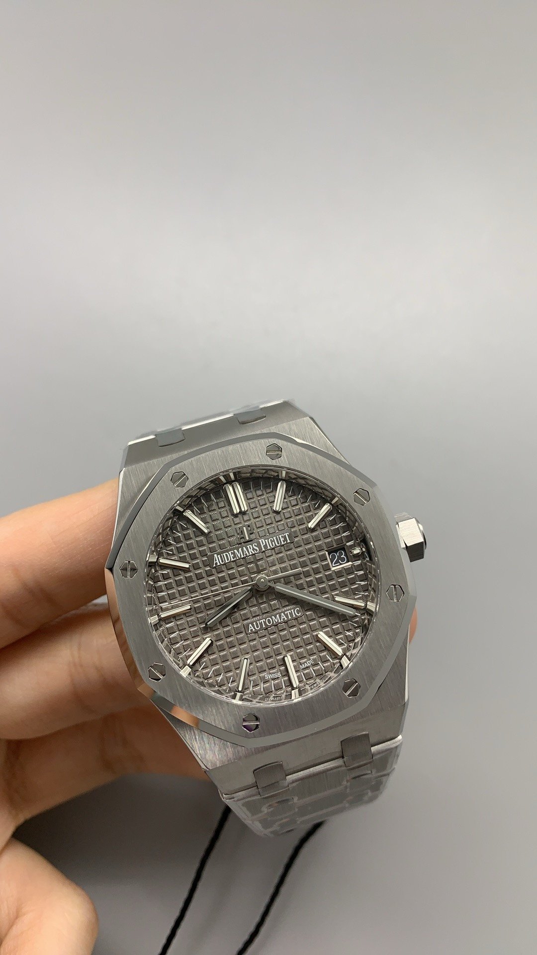 Compact 37mm Royal Oak in stainless steel, defined by its iconic octagonal bezel and a refined grey ruthenium dial with the “Grande Tapisserie” pattern. It runs on a 3132 movement that provides a reliable 60-hour reserve.