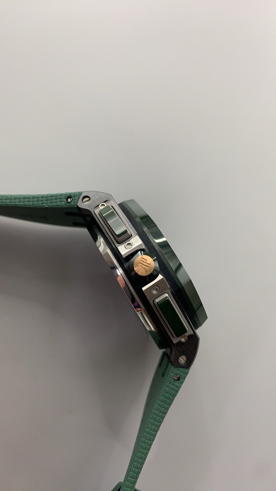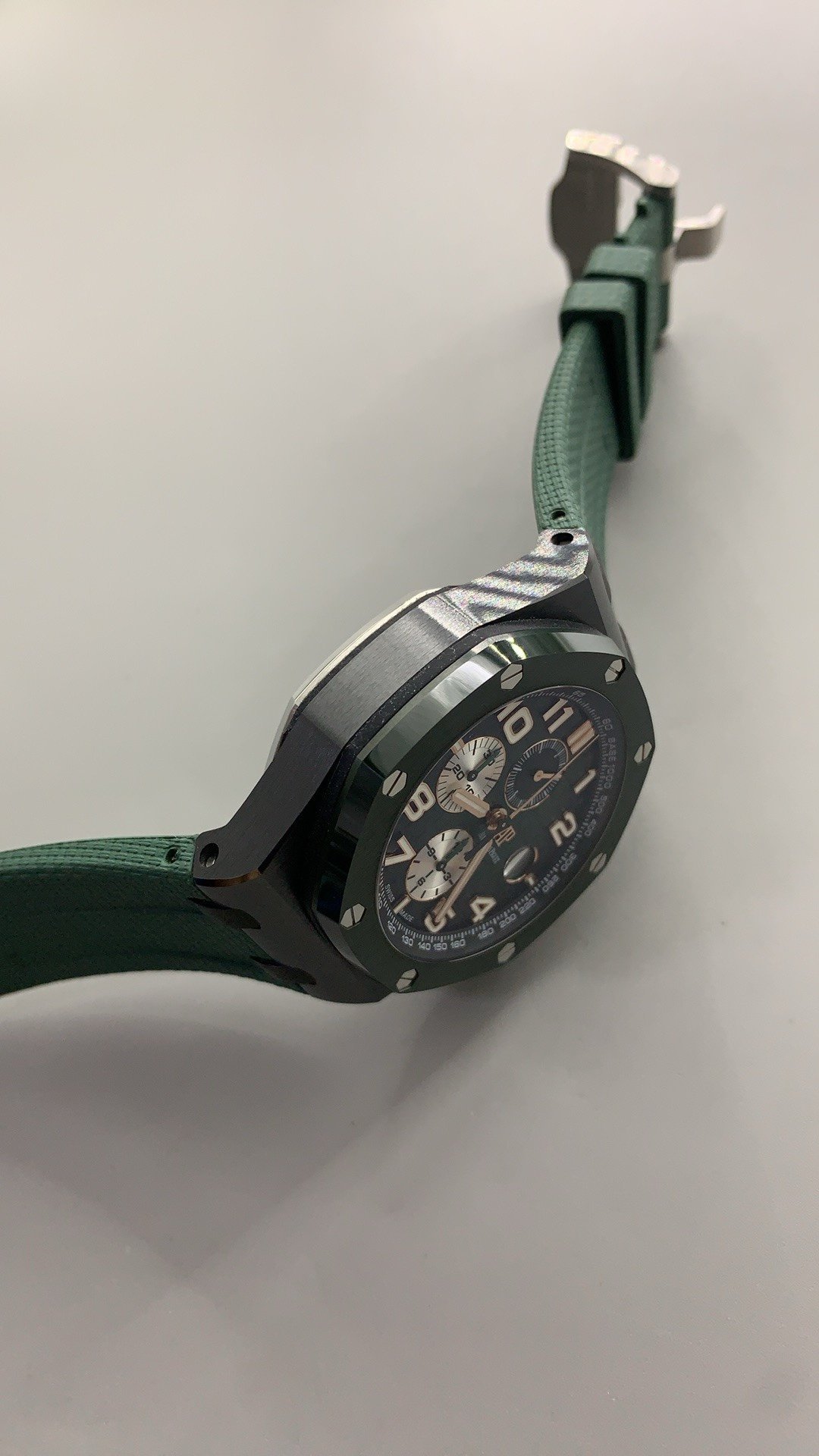 Royal Oak Offshore Ceramic 26405CE Super Clone has a black 44mm ceramic case with a beautiful green ceramic bezel. The octagonal bezel has the iconic 8 screws holding it down. Audemars Piguet Royal Oak Offshore Ceramic 26405 CE Super Clone has a complementing green rubber strap with textile decoration and a titanium pin buckle.